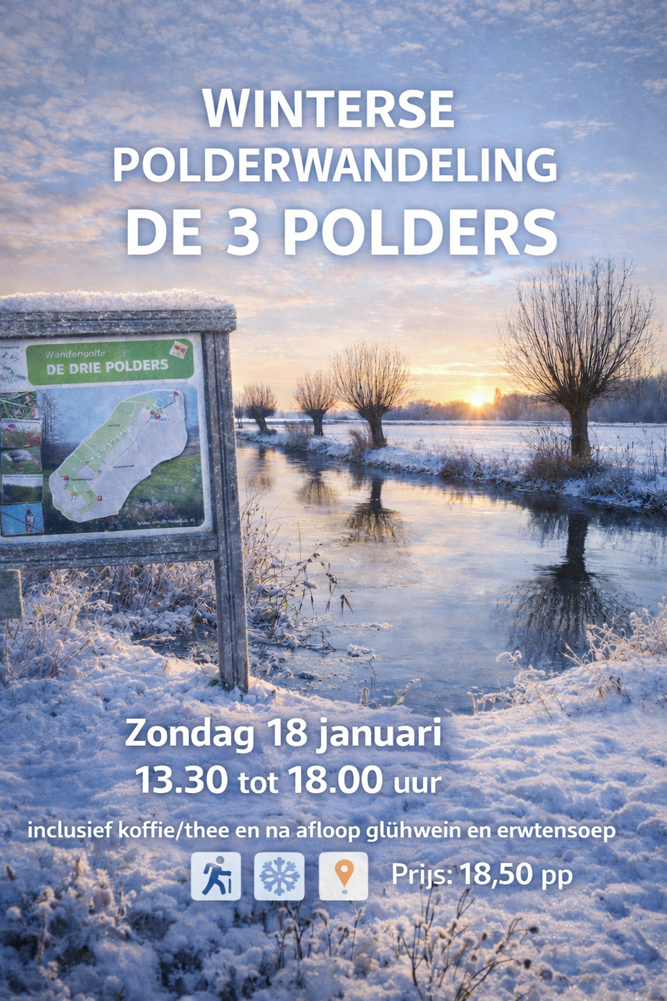 Om 14.00 uur trekken we eropuit voor een mooie wandeling door het winterse polderlandschap.