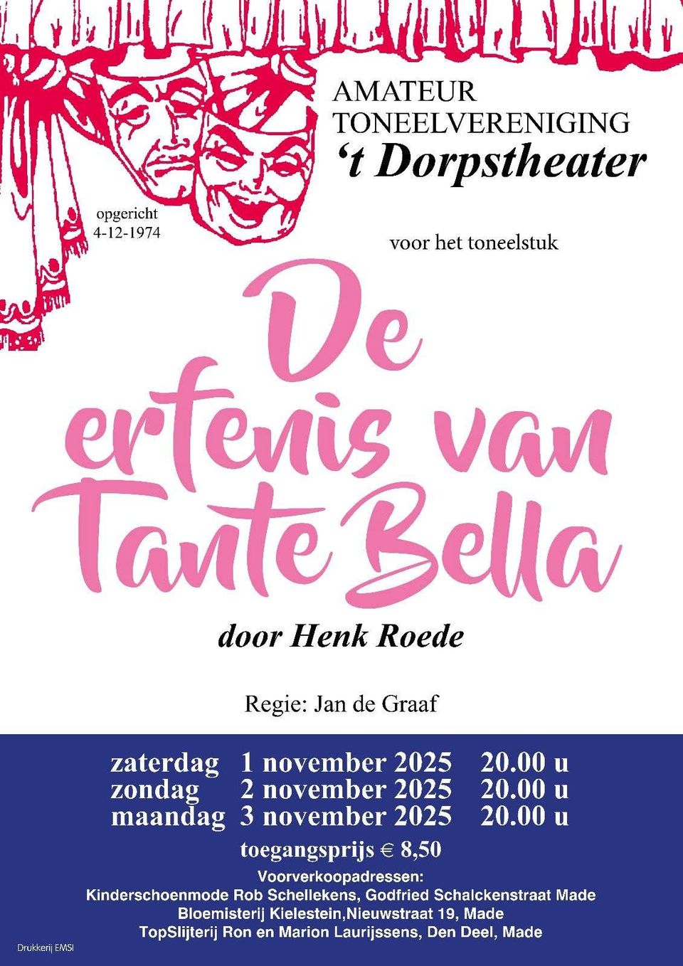 Made - Zet het eerste weekend van november maar vast in uw agenda: ’t Dorpstheater Made voert dan weer een klucht op in het Bernardus Theater in Made. Zaterdag 1, zondag 2 en maandag 3 november kunt u komen kijken naar ‘De erfenis van Tante Bella’. Een stuk geschreven door Henk Roede en geregisseerd door Jan de Graaf. Hij heeft er weer alles aan gedaan om er weer hilarische avonden te maken. De spelers en crew hebben er zin in om bij u de lachsalvo’s en tranen te ontfutselen. Het stuk gaat over, zoals ze zelf gedacht hadden, twee broers, dat ze na het overlijden van hun Tante Bella de wat gedateerde beautysalon hebben geërfd. Ze gaan het boeltje wat opknappen. Maar het kan beter verkocht worden als een goed lopende zaak. Het grootste probleem is dat Tante dus geen personeel had, en wat is dan de oplossing: De 2 bouwvakkers zullen dat klusje ook zelf moeten klaren in al hun onervarenheid. De broers wringen zich dus in allerlei moeilijke bochten, maar overal is een oplossing voor, mede door een beetje kennis van een stagiaire, zodat de vrouwelijke klanten geholpen kunnen worden. Al zijn de praktijken wat vreemd soms. Het volgende probleem is dat er nog een ver nichtje uit Canada ook recht heeft op haar aandeel (al weet ze nog niet dat haar lieve Tante nog niet gestorven is) en als het testament via de notaris boven water komt, blijkt alles nogal vreemd in elkaar te zitten. Al deze ingrediënten zorgen dat dit stuk weer stof is voor een mooi verhaal en een onvergetelijke avond. Zorg dat u er weer bij bent deze dagen. Alles gaat weer zoals u van onze vereniging gewend bent. De kaarten zijn weer in de verkoop voor de prijs van 8,50 euro. Verkoopadressen zijn Kinderschoenmode Rob Schellekens, Bottelier Laurijssens en Kielestein Bloemisterij op de bekende adressen. Bent er op tijd bij, want meestal zijn ze zo uitverkocht. KAARTEN KUNNEN ALLEEN KONTANT AFGEREKEND WORDEN !!